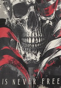 Beiges Baumwoll-T-Shirt mit einem Totenkopf-Motiv, amerikanische Flaggenakzente in Rot und Schwarz, mit dem Text "FREEDOM IS NEVER FREE" darunter gedruckt.