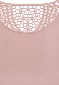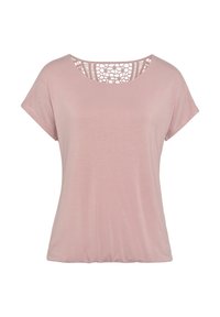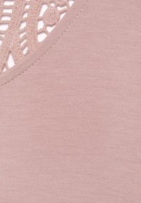 Zwei Damen-T-Shirts ausgestellt: eines in hellrosa mit einem Spitzen-Ausschnitt am Hals, und das andere in einfarbig burgunderrot mit einem runden Ausschnitt.