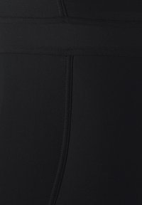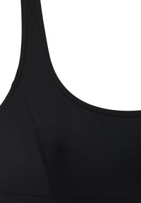 Schwarzer Badeanzug mit breiten Trägern, Rundhalsausschnitt und tailliertem Design. Gleiche Textur und kontrastierende Nähte betonen die Form.