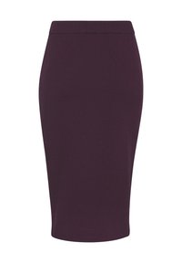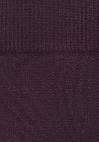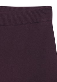 Gestrickter lila Pullover und Midi-Rock-Set mit gerippten Säumen; kombiniert mit schwarzen Schnürstiefeln; glatte Textur; Modell posiert im Freien.