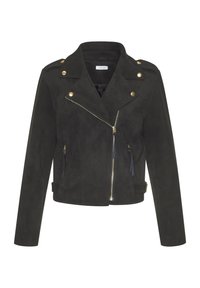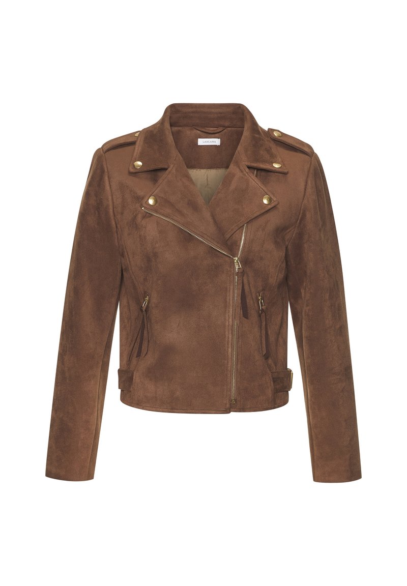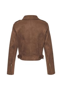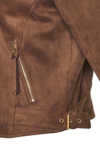 Braune Kunstlederjacke mit tailliertem Design, diagonaler Reißverschlussöffnung, Schulterklappen und goldfarbenen Hardware-Akzenten. Verfügt über seitliche Reißverschlusstaschen.