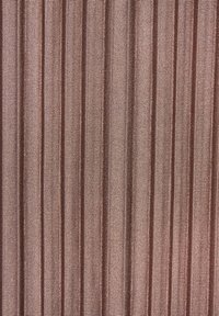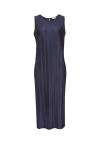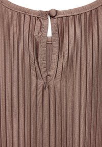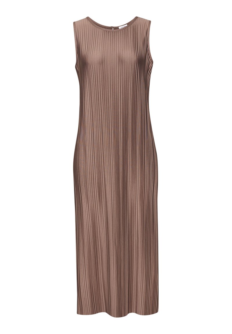 Langes, ärmelloses Kleid in Hellbraun, mit vertikalen Falten und rundem Ausschnitt. Glatte Textur mit schlanker, gerader Silhouette.