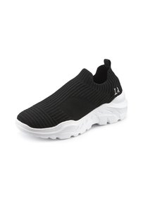 Dunkelschwarzer Slip-On-Sneaker aus gestricktem Material mit gerippter Textur, weißer Gummisohle und kreisförmigem Profil. Mit einem Rückzieher für einfaches Anziehen.