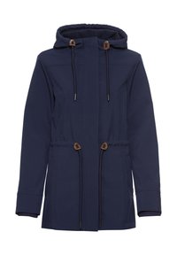 Marineblauer Softshell-Mantel mit Kapuze, Zugbanddetails und zwei Fronttaschen, kombiniert mit einem cremefarbenen Rollkragenpullover und hellblauen Jeans.