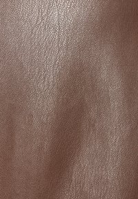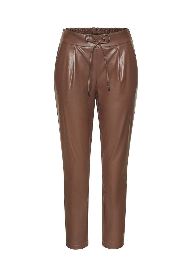 Braune Kunstlederhose mit einem Kordelzugbund, schmal zulaufendem Schnitt, Faltendetails und glatter, glänzender Textur. Der Saum ist abgeschlossen.