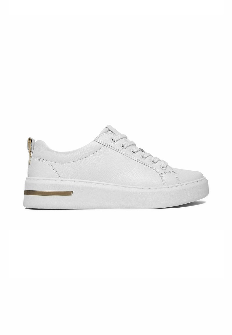 Weißer Leder-Sneaker mit niedrigem Schnitt, Schnürung vorne und dicker Sohle mit goldenem Akzent nahe der Ferse auf einfachem weißem Hintergrund.