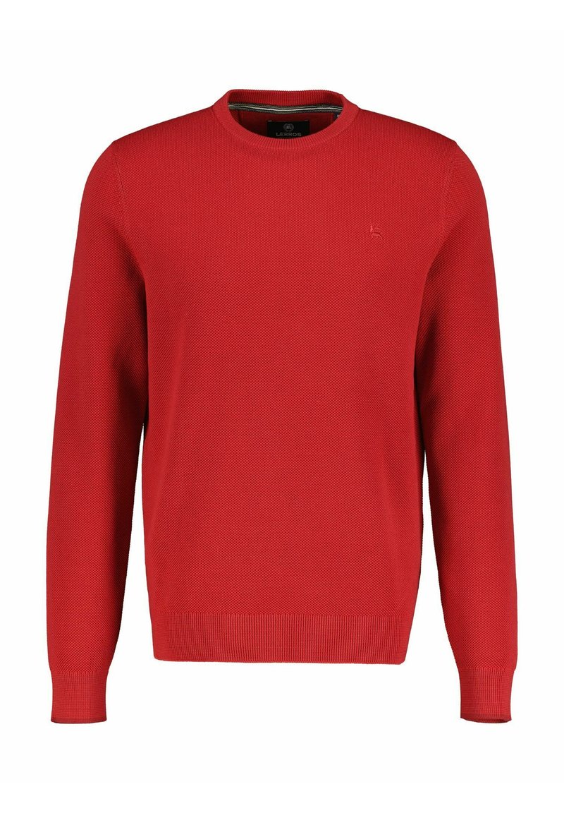 Roter Strickpullover mit Rundhalsausschnitt, langen Ärmeln und strukturiertem Muster. Verfügt über gerippte armbündchen und Saum, kleines Logo auf der Brust.