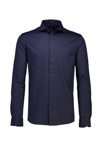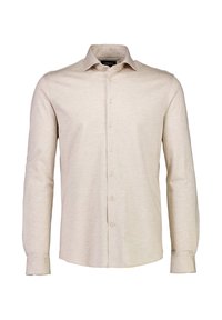 Langärmeliges Hemd mit Knopfleiste aus gedämpftem oligrünem Stoff; verfügt über einen spitzen Kragen, eine Knopfleiste und ein-Knopf-Manschetten.