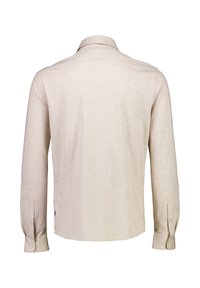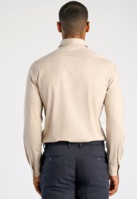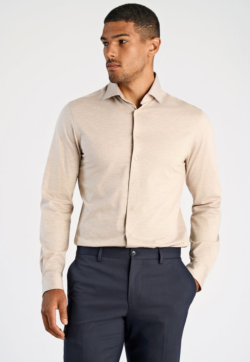 Mann trägt beige langärmliges Hemd mit Knöpfen, in dunkelblaue Stoffhose gesteckt, vor einfarbigem Hintergrund.