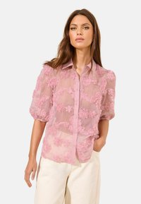 Frau trägt eine transparente braune Bluse mit Blumenmustern, weite blaue Jeans, einen braunen Gürtel, goldene Armbänder und schwarze Sandaletten mit offenem Zehenbereich.