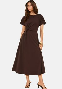 Tefarbene, knielange Kleid mit kurzen Ärmeln und frontalem Knoten-Detail aus einem weichen, strukturierten Stoff, der eine lockere Passform und einen sanften Fall bietet.