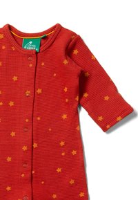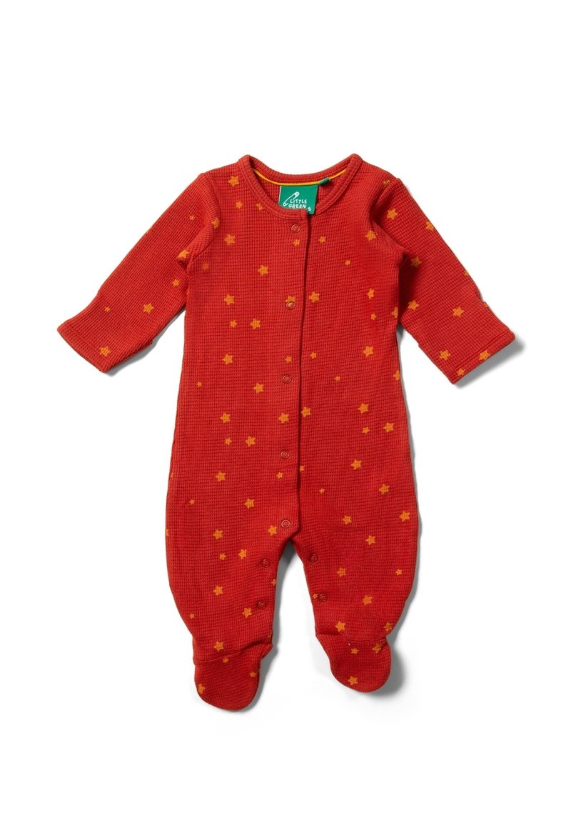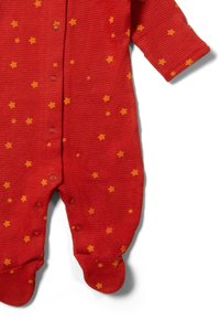 Roter Baby-Overall aus strukturiertem Waffelstrickstoff. Mit gelben Sternmustern, langen Ärmeln und Druckknöpfen entlang der Vorder- und Beinseite.