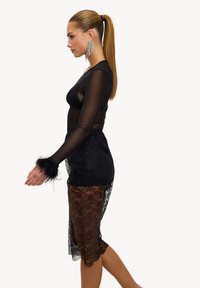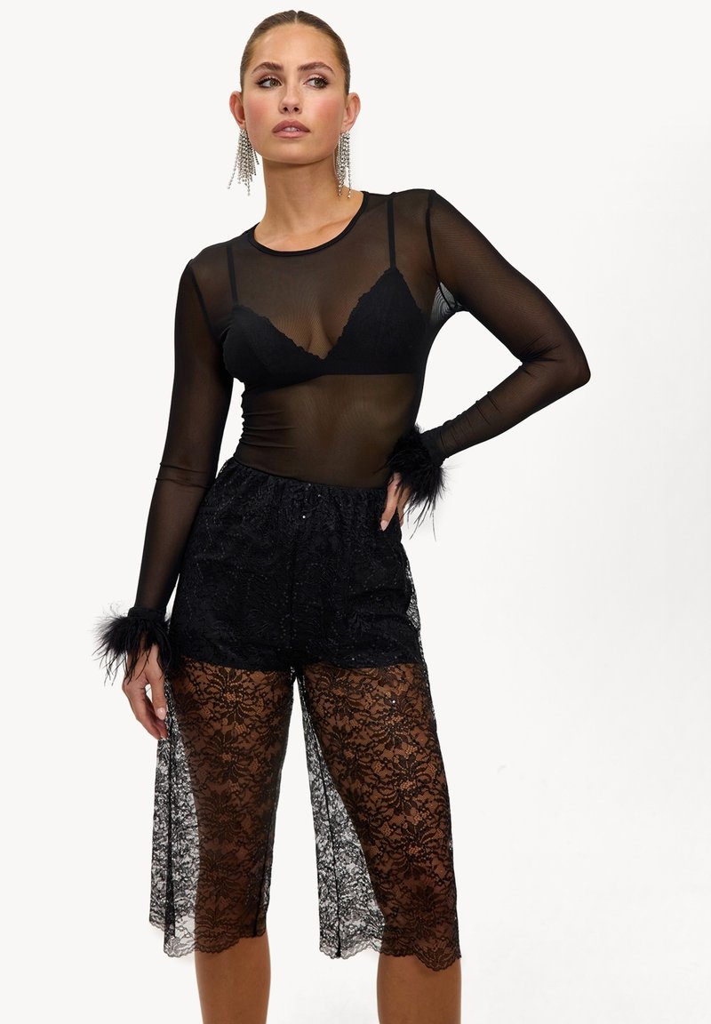 Schwarzes langärmliges Netzoberteil kombiniert mit Spitzen-Shorts mit Blumenmuster und Pelzakzenten an den Bündchen. Durchscheinender Stoff durchgehend.