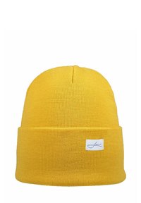 Helle gelbe Strickmütze mit gerippter Textur und einem kleinen weißen Etikett an der Seite. Tragen von einer Person mit langen dunklen Haaren und einem Bart.