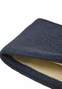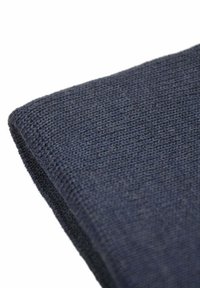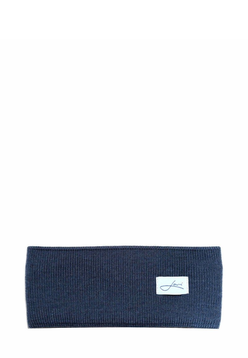 Dunkelblaues gestricktes Stirnband mit einem strukturierten Muster und einem kleinen weißen Etikett. Das Stirnband ist breit und wurde entworfen, um die Ohren zu bedecken.