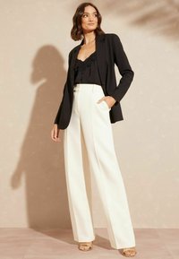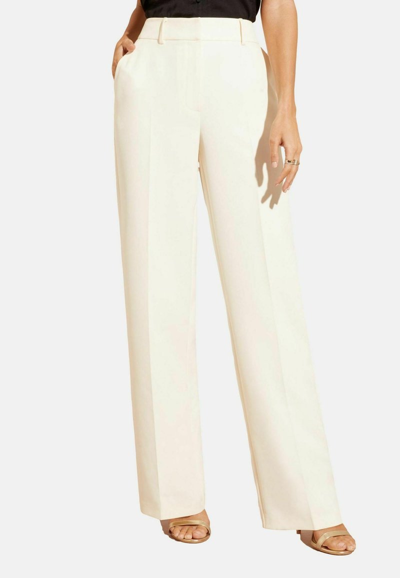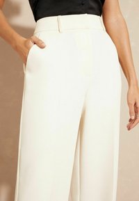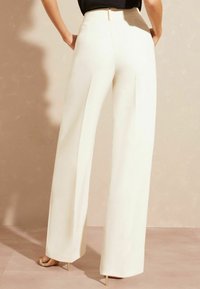 Frau trägt hoch taillierte, weit geschnittene Cremefarbene Hosen, kombiniert mit goldenen Sandalen mit offenen Zehen, und steht mit einer Hand in der Tasche.