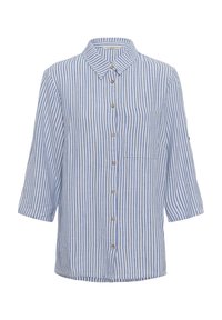 Marineblaue Knopfleiste mit Brusttasche, hochgekrempelten Ärmeln und hellbraunen Knöpfen. Weicher Stoff und lockerer Schnitt.