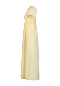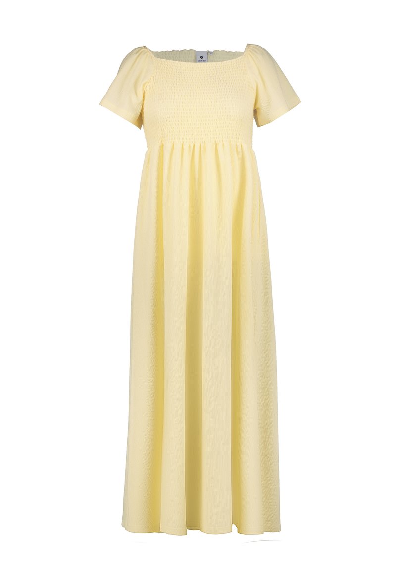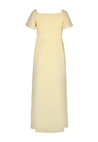 Hellgelbes Maxikleid mit kurzen Puffärmeln, gerafftem quadratischem Ausschnitt und fließendem Rock.