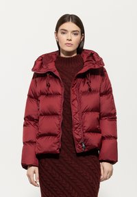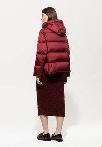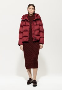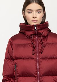 Burgunderfarbene Steppjacke mit Kapuze, Reißverschluss vorne und Kordelzugdetails. Verfügt über ein gesteppte Design und glatte Textur. Trägt man über einem gestrickten Pullover.