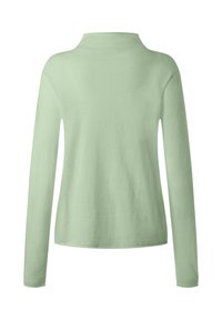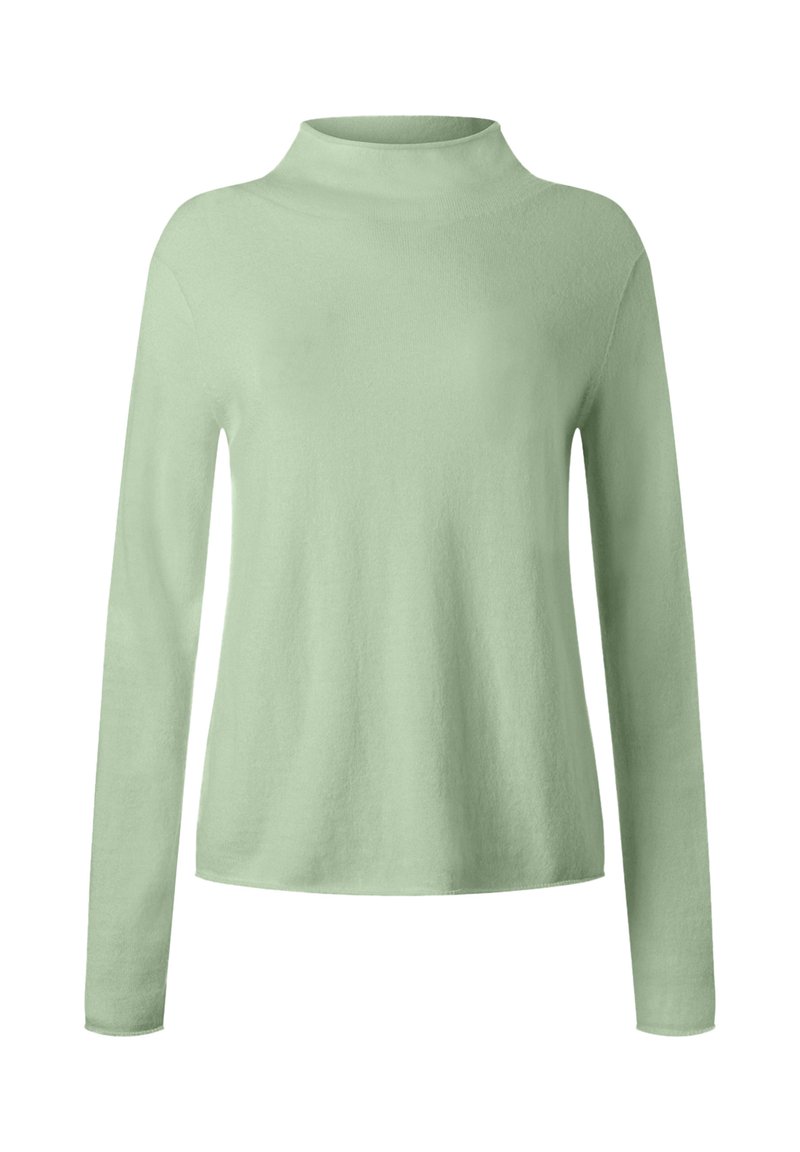 Hellgrüner Pullover mit langen Ärmeln und hohem Kragen. Weiche, glatte Textur und lockere Passform. Keine sichtbaren Muster oder Metallteile.