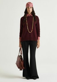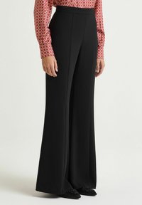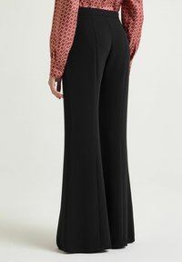 Schwarze, weit geschnittene Hosen aus glattem Stoff mit hoher Taille und maßgeschneidertem Design. Akzentuiert durch aufwändige schwarze Schuhe.