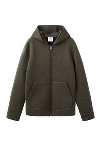 Marineblauer Reißverschluss-Kapuzenpullover aus dickem, strukturiertem Stoff. Verfügt über eine Fronttasche, gerippte Bündchen und eine Kapuze mit Kordelzug. Getragen über einem schwarzen Hemd.