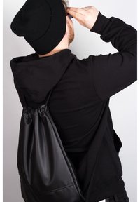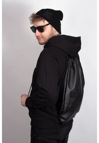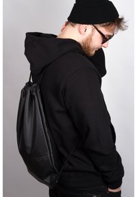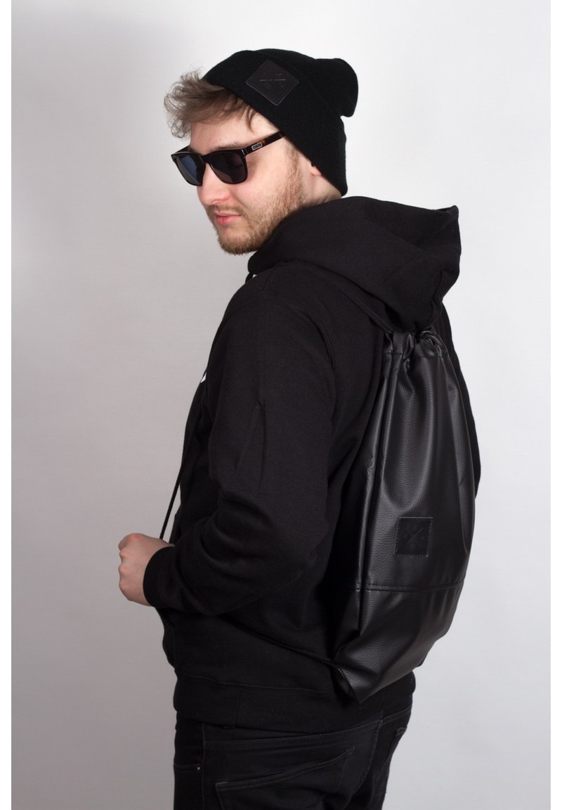 Schwarze Kordelzugtasche aus strukturiertem Material, auf dem Rücken getragen. Modell in einem schwarzen Hoodie und Beanie, mit Sonnenbrille, minimalistischem Detail.