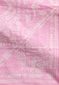 Rosa quadratisches Halstuch mit weißen Blumen- und Paisley-Mustern, symmetrischem Design und einem kleinen Stoffetikett an der Seite.