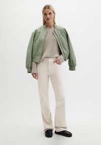 Person trägt beige gerade geschnittene Hose, schwarze Slipper, einen beigen Strickpullover und eine grüne Bomberjacke mit hängenden Ärmeln.