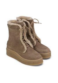 Taupefarbener Wildleder-Stiefel mit dicker profilierter Sohle, Schnürung vorne und cremefarbener Lammfellfütterung am Kragen und an der Zunge.