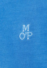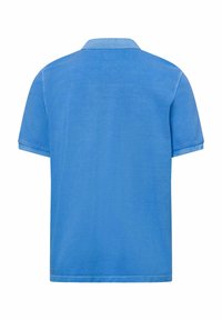 Himmelblaues Baumwoll-Poloshirt mit kurzen Ärmeln, einer Knopfleiste mit zwei Knöpfen und einem kleinen gestickten Logo auf der linken Brust. Weiche Textur.
