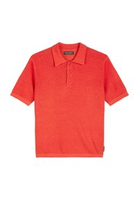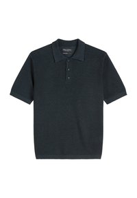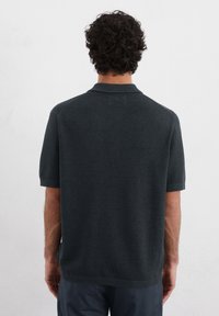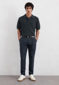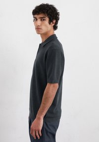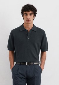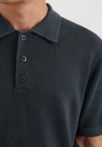 Dunkelgraues Strick-Polohemd mit kurzen Ärmeln, Knopfleiste und geripptem Kragen; getragen mit blauen Hosen und einem schwarzen Gürtel.