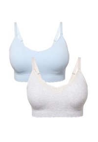 Zwei drahtlose Softcup-Bralettes, eines in hellgrau mit glattem Stoff, das andere in Salbeigrün mit Spitzenrand, beide mit verstellbaren Trägern.