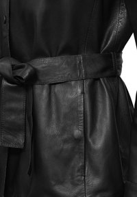 Schwarze Lederjacke mit langen Ärmeln, vorderem Knopfverschluss, zwei Brusttaschen und einem gebundenen Taillengürtel. Glatte Textur und taillierte Passform.