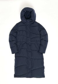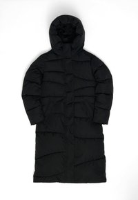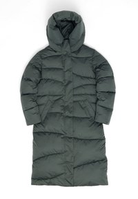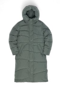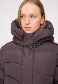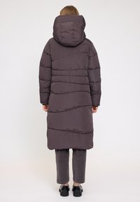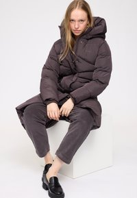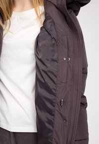 Langer, gefütterter Mantel in Dunkelbraun mit hohem Kragen und Kapuze. Hat horizontale Nähte und Taschen. Getragen über grauen Hosen und schwarzen Schuhen.