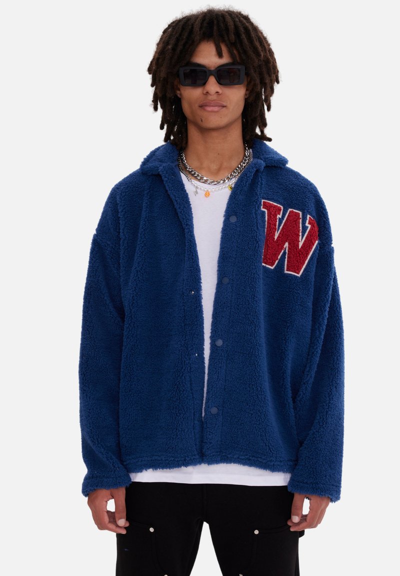 Blaue Plüsch-Fleecejacke mit Kragen, Knöpfen vorne und einem roten "W", das auf der linken Brust gestickt ist. Model trägt Sonnenbrillen.