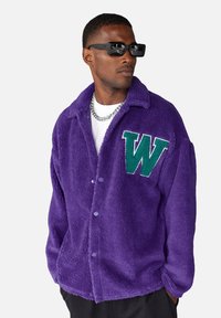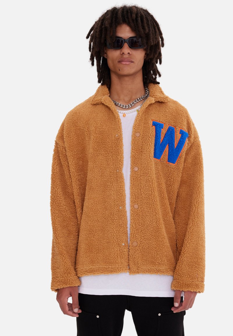 Braune Fleece-Jacke mit Kragen-Design, ausgestattet mit einem blauen gestickten "W" auf der linken Brust und Knopfverschlüssen.