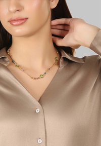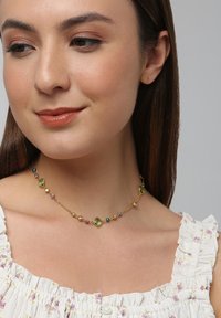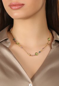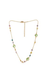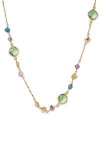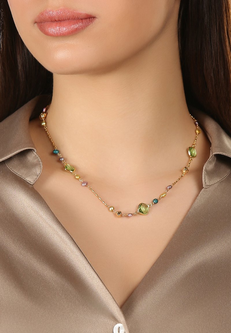Diese exquisite Halskette präsentiert auf elegante Weise eine lebendige Auswahl an mehrfarbigen Steinen in verschiedenen Größen und sorgt für einen fesselnden optischen Reiz. Die Farbkombination verleiht jedem Outfit eine charmante und verspielte Note und macht es zu einem vielseitigen Kleidungsstück, das sowohl für Freizeitkleidung als auch für besondere Anlässe geeignet ist. Egal, ob Sie sich für einen Abend schick machen oder Ihrem Alltagslook Flair verleihen, diese Halskette wird mit Sicherheit ein unvergessliches Statement setzen.