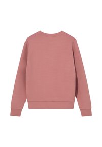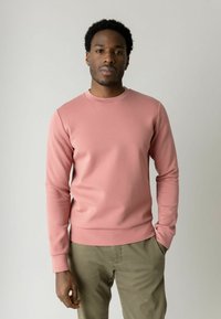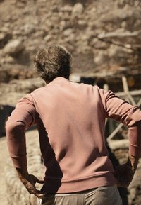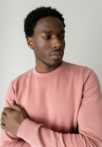 Mann mit kurzen lockigen Haaren, der ein rosa Langarmshirt und olivgrüne Hosen trägt, vor einem einfarbigen hellgrauen Hintergrund steht.