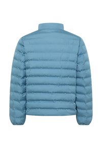 Mann, der eine hellblaue gesteppte Jacke mit hohem Kragen, Reißverschluss vorne und schwarze Hosen trägt, steht vor einem einfarbigen grauen Hintergrund.