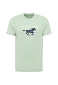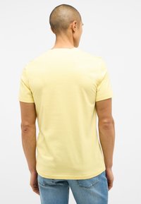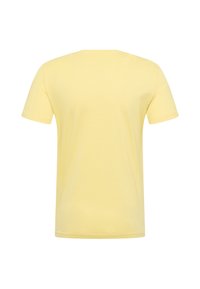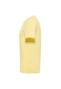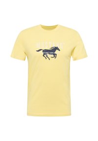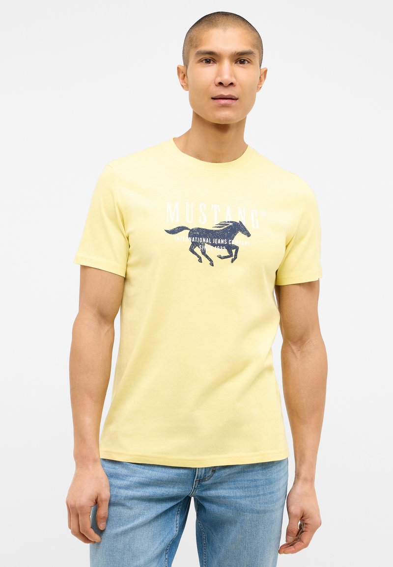Gelbes Baumwoll-T-Shirt mit Rundhalsausschnitt, das einen grafischen Druck eines Pferdes und Markentext in Marineblau zeigt. Kurze Ärmel, lässiges Design.