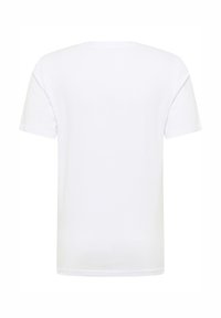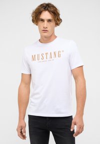 Weißes Baumwoll-T-Shirt mit Rundhalsausschnitt und kurzen Ärmeln, das das "MUSTANG"-Logo in orangefarbener Druckschrift auf der Brust trägt. Schwarzjeans werden getragen.