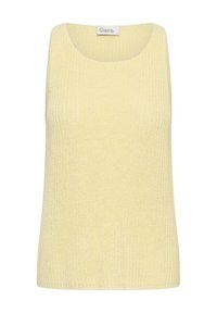 Beige gestricktes Tanktop mit offenen Seiten, kombiniert mit einem fließenden beigefarbenen Rock. Das Model hält den Rock und zeigt dessen Weichheit und Fall. Schwarze Sonnenbrille ergänzt den Look.