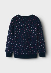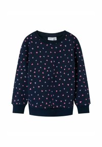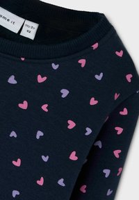 Marineblaue Sweatshirts mit einem Muster aus kleinen pinken und lavendelfarbenen Herzen, Rundhalsausschnitten und gerippten Bündchen und Säumen.