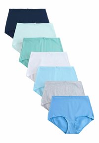 Sieben Damenslips mit hoher Taille in einfarbigem Bordeaux, mit weißen Pünktchen, Koralle, Creme, Koralle, Grau und hellrosa Farben, in einer Reihe angeordnet.