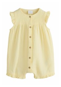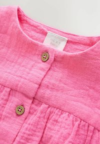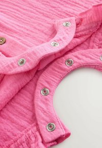 Ärmelloser rosa Baby-Strampler mit Holzknöpfen vorne, gerafften Schultern und Beinöffnungen, aus strukturiertem Stoff gefertigt.
