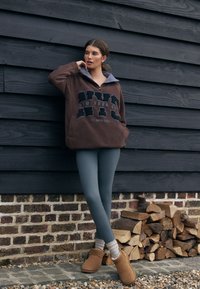 Frau lehnt an einer dunklen Holzwand und trägt eine braune NYC-Zip-Fleecejacke, graue Leggings, beige Socken und braune Knöchelstiefel neben gestapeltem Brennholz.