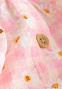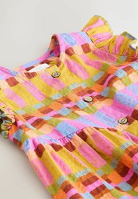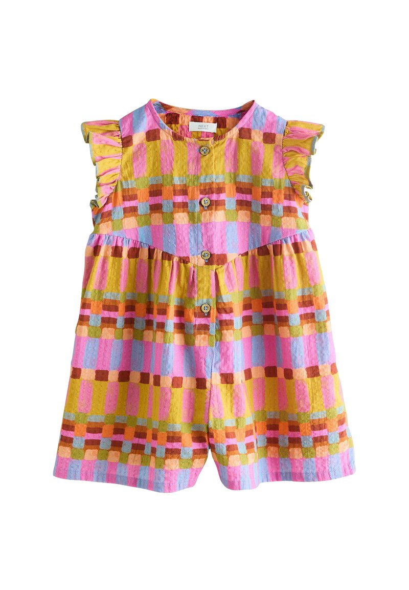 Ärmelloser Strampler für Kleinkinder mit Rüschen an den Schultern, mehrfarbigem pastellfarbenem Karomuster und Knopfverschluss vorne.
