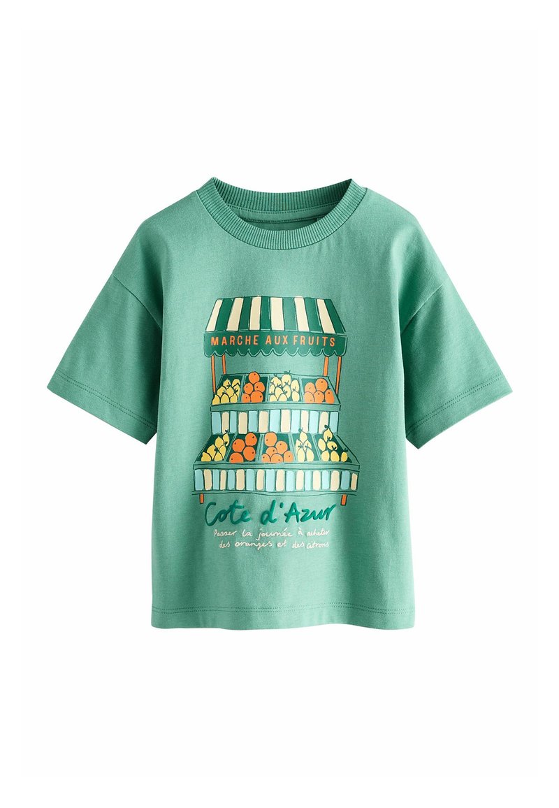 Grünes T-Shirt mit kurzen Ärmeln, bedruckt mit einer Illustration eines Obstmarktstands und französischem Text über die Côte d'Azur und saisonale Früchte.