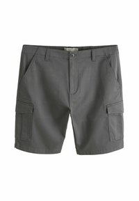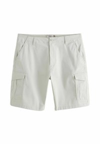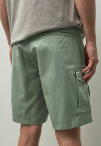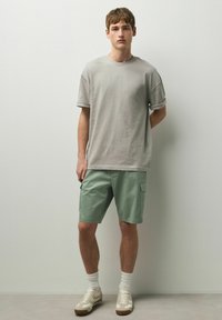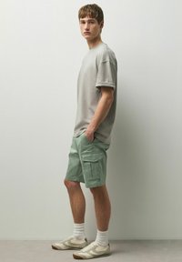 Mann trägt hellgrüne Cargoshorts und ein beiges T-Shirt, Hand ruht neben dem Oberschenkel, sichtbar von der Taille bis zu den Knien.